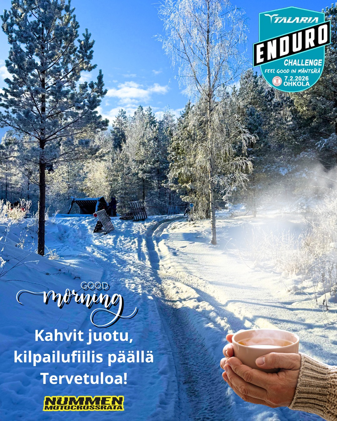 Kilpailut alkavat klo 9 Nummen motocross-radalla. Aamukahville kannattaa tulla radalle jo ajoissa – Annen herkulliset leipomukset ja täytetyt sämpylät käynnistävät päivän mukavasti, ja kahviossa on tarjolla myös lounasta klo 10 (runsas mutta rajoitettu erä), grillimakkaraa sekä lämmintä toast-leipää alkaen klo 9.
